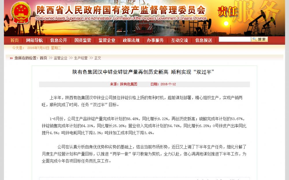 陜西國資委網站、中國有色報:漢中鋅業鋅錠產量再創歷史新高 順利實現“雙過半”目標